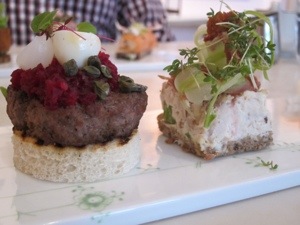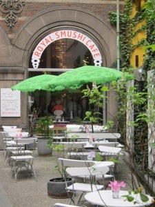 Once we were sorted, it was time for lunch. The Royal Smushi Cafe is right in the heart of Copenhagen, situated through the lane way between the iconic Danish stores, Georg Jensen and Royal Copenhagen. The name itself is good enough to eat! Smushi is a combination of sushi and smørrebrød – traditional Danish open sandwiches. That pretty much describes the food, Japanese / Scandinavian inspired food sitting on different types of bread, with exquisite attention to detail for the flavours, textures and presentation. The smushi are presented on flat platters by Royal Copenhagen. The cafe’s decor is cool designer-kitsch, cosy but not overdone, with a gorgeous, elaborate painting on the back wall.