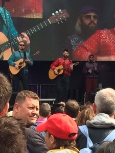 Back we went to line up among the weeds. Seriously, it wouldn’t have taken much effort to send someone out with a whipper snipper the week before just to tidy things up a bit. While those in the know have told us that the technical side of the event has been fantastic this year, they are missing some of the basics for looking after the audience. Service vehicles drive through the door that people are queueing in front of, so we all have to move to let then through. There is no orderly way to get in to the hall. People are hanging around on the sidelines then pushing in front of those of us who have been in the queues for three hours once the doors open. Once inside, there are no signs directing the audience to the various seating and standing areas, and the crowd control staff don’t even have megaphones so they can only talk to the five people standing directly in front of them.