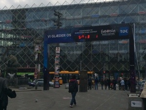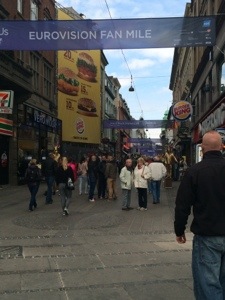 The site this year is B&W Hallerne, a former shipbuilding yard. The site still has much of its abandoned industrial feel. Weeds grow up through the cracked concrete wasteland where we queue up. Food and drink is provided from food vans and temporary bars. Toilets are portaloos – although immaculately maintained. Yet once inside, the stage, the lighting, it’s all completely state-of-the-art, built exclusively for these Eurovision shows. And the best part is that the ‘Fan Zone’ – the floor area reserved for OGAE members, is the area right in front of the stage! We are so close to the stage that we can feel the breeze from the wind machines!