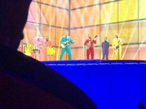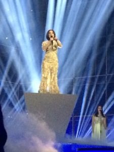 Overall the show was very slick and the presenters very professional. Talking in between acts was kept to a minimum, with the focus on the music. The postcard theme of making the flag and focusing on the performer rather than their country was very inventive. The comedy sketches in between were clearly inspired by the success of last year’s comedy sequences – funny and short. The crowd cheered when the winner of ‘wearing most silver’ was announced – hey guys, it’s not really a competition, is this really something to be proud of?