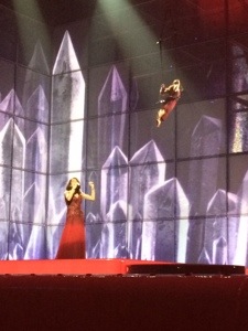 Another crowd and public favourite. How can you go past a powerful ballad, a gorgeous, ruby red dress, randomly changing backgrounds and a dancer suspended way above ground on a trapeze?